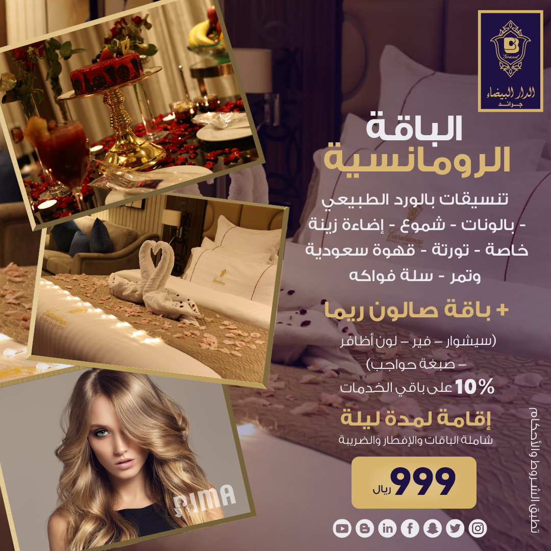 استمتعوا بقضاء ليلة فاخرة ومميزة في فندق الدار البيضاء جراند بسعر 999 ريال فقط (شامل الباقات والإفطار والضريبة) مع الباقة الرومنسية التي تتضمن: